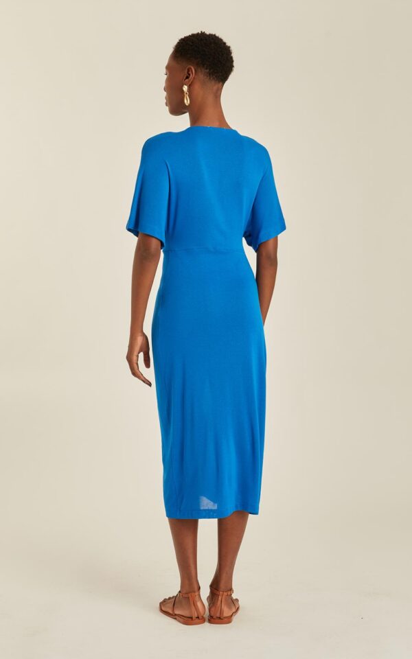 Crafted from lightweight knit fabric, this beach cover-up blends elegance with comfort. The V-neckline elongates the silhouette, while the twist detail at the waist enhances its feminine appeal. Featuring short sleeves, a front slit, and a midi length, it’s perfect for seaside strolls or unwinding at sunset in effortless style.